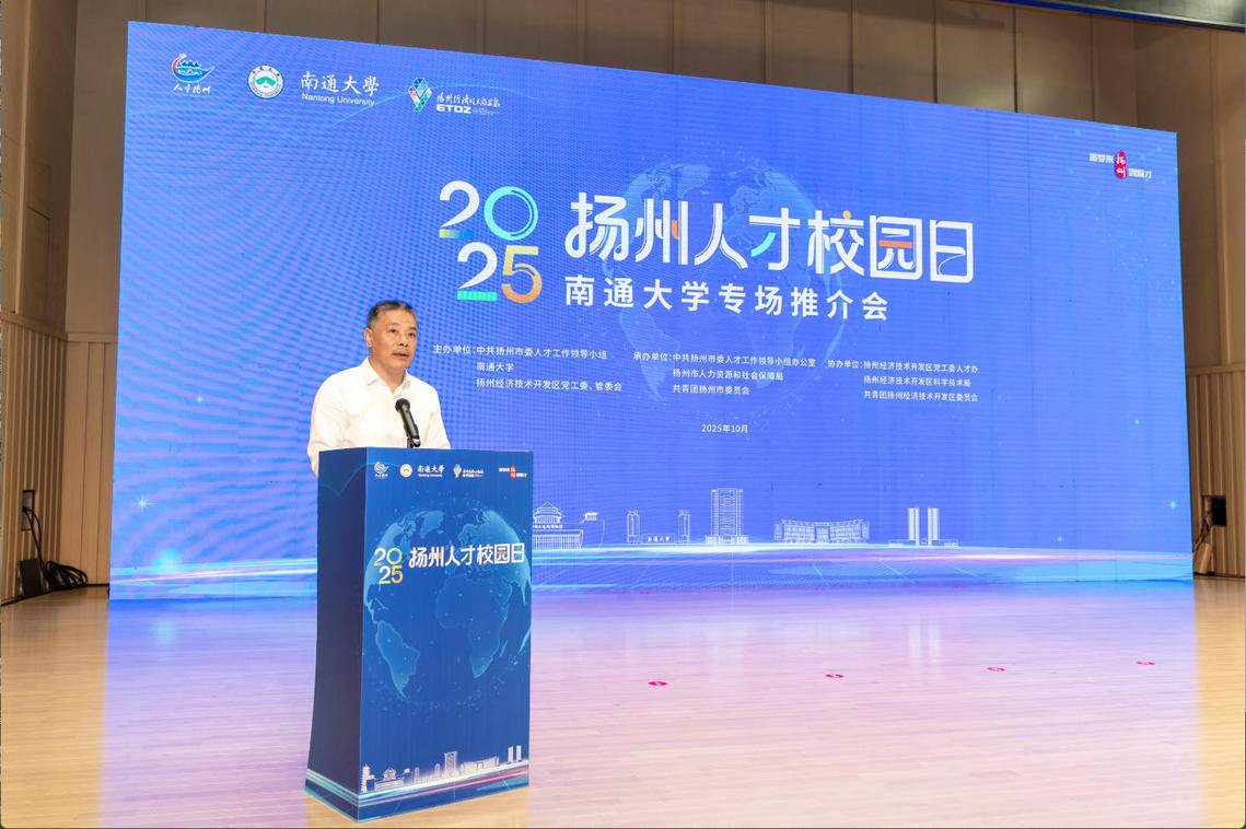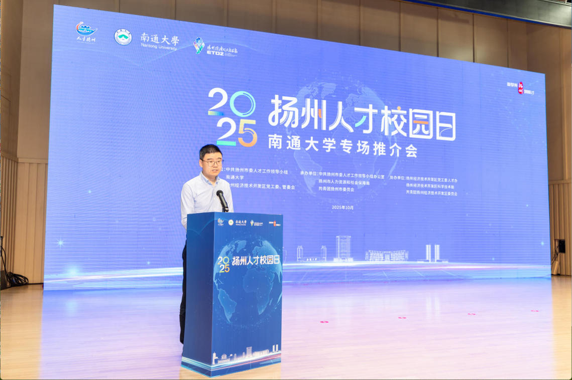 10月15日,2025年“扬州人才校园日”活动走进南通大学,通过城市推介、专场招聘、非遗文化体验等多元形式,为师生打造了一场全方位、沉浸式的扬州市及扬州经开区体验。校长王建浦、扬州经济技术开发区管委会主任胡春风出席活动并致辞。