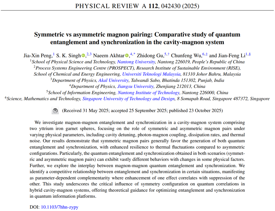 近日,我院彭家鑫博士、李剑锋副教授与马来西亚理工大学S. K. Singh博士后、新加坡科技设计大学吴春凤教授等学者合作,在量子纠缠与量子同步研究方面取得新进展。相关研究成果以《Symmetric vs asymmetric magnon pairing: Comparative study of quantum entanglement and synchronization in the cavity-magnon system》为题发表于自然指数期刊《Physical Review A》上。南通大学网赌平台 为第一单位。